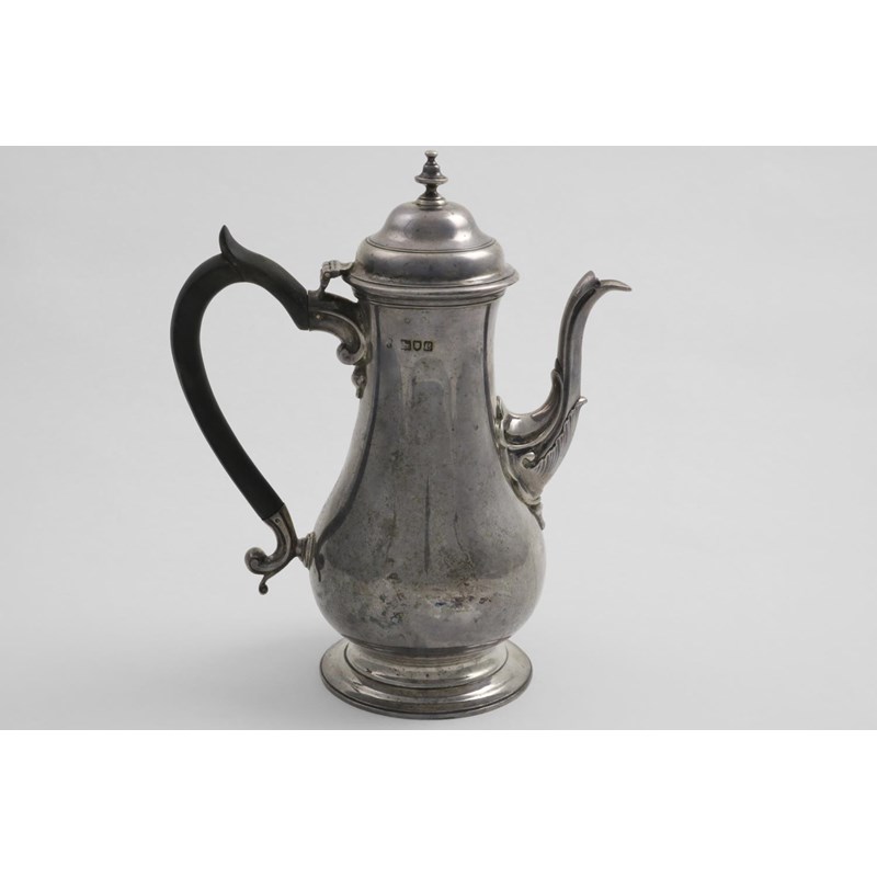 A LATE VICTORIAN BALUSTER COFFEE POT with a domed cover, knop finial and a spreading circular foot, the spout with a leaf wrapping at the base, by Charles Stuart Harris, London 1898; 9.6" (24.4 cms) high; 23.1 oz