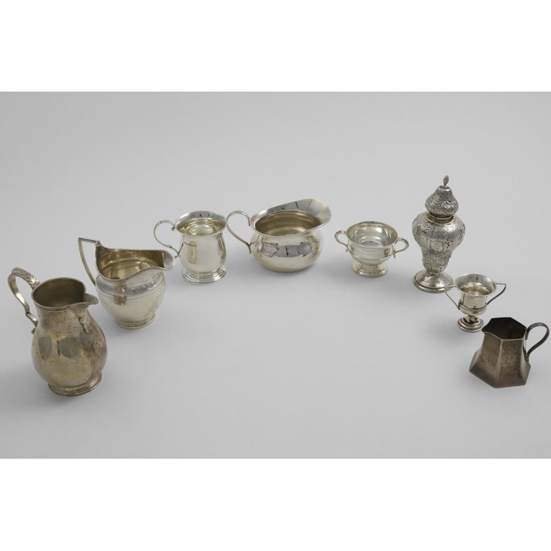 A Continental pepper caster with English import marks for London 1924, a cream jug by Charles Stuart Harris & Sons, London 1930, three other various cream/milk jugs (one initialled), a small mug, inscribed "Ruth", and two small trophy cups (one inscribed); the pepper 5.25" (13.3 cms) high; 25.4 oz (8)