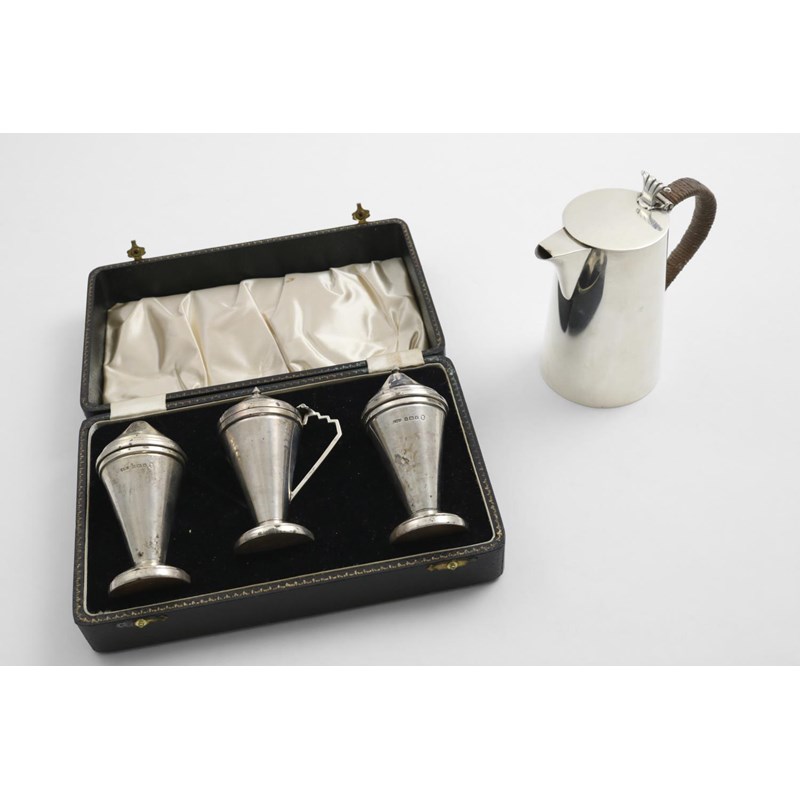 by A.L. Davenport, Birmingham 1934, in a fitted case and a late Victorian tapering hot milk jug with an insulated handle, by J.T. Heath and J.H. Middleton, London 1886; the latter 5" (12.5 cms) high; 6.8 oz weighable silver (2)