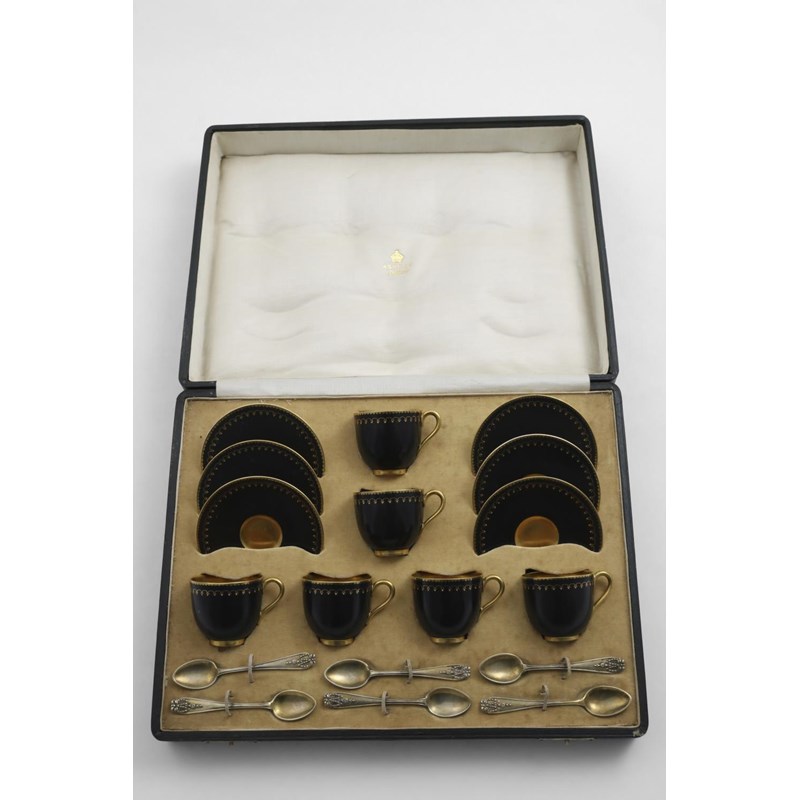 A GEORGE V CASED WORCESTER PORCELAIN DEMI-TASSE COFFEE SERVICE FOR SIX with gilt-decorated black cups & saucers and six silvergilt coffee spoons, hallmarked London 1917, retailed by Asprey; the box 13.7" (35 cms) long