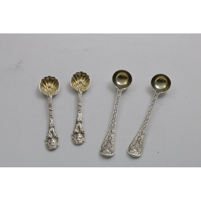 Elizabethan pattern, crested, gilt bowls, by George Adams, London 1856 and a pair of cast, naturalistic salt spoons with mask terminals & gilt bowls, maker's mark "WC", London 1840; the latter pair 3.75" (9.5 cms) long; 2.7 oz (4)