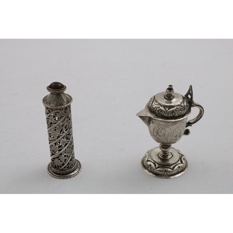 in the form of a flagon with engraved and embossed decoration and an A-shaped thumbpiece (for aqua/agua), unmarked, and a 19th century cylindrical container with pierced and engraved sides and a lift-off cover with a stone-set finial, also unmarked; the latter 4.2" (10.6 cms) high; 4.5 oz (2)