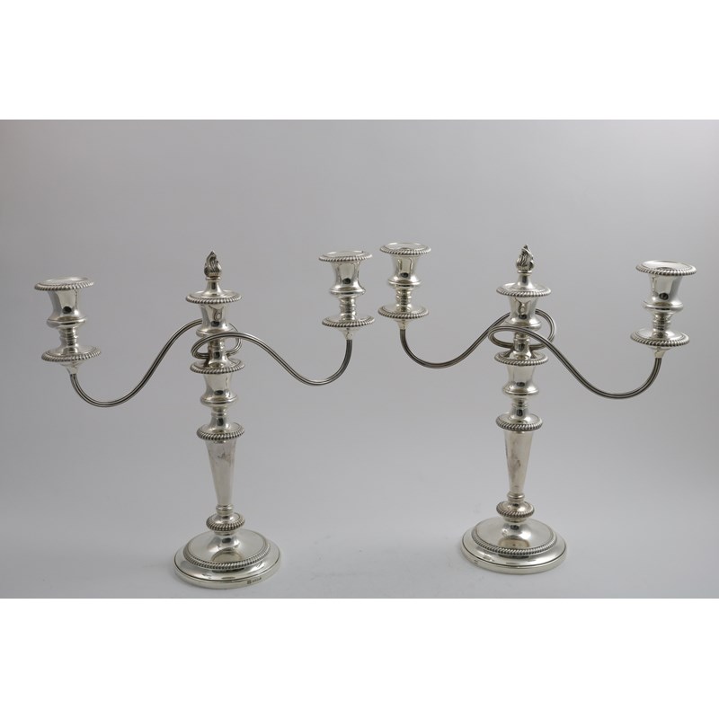 on circular bases with reeded scroll branches, gadrooned borders & central flame finials, by the Barker Ellis Silver Co., Birmingham 1975 (loaded bases);  14.5"  37 cms high at their highest adjustment