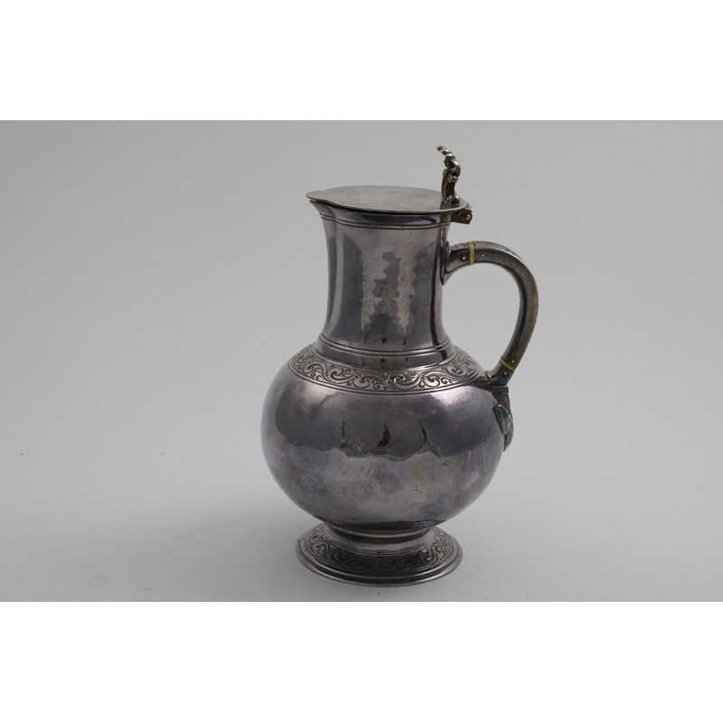 with a baluster body and spreading circular foot, each decorated with a band of chased scrolls, the hinged cover with a shell and scroll thumbpiece, engraved with a greyhound, by George Fox, London 1864;  10.75"  (27.4 cms) high;  43.4 oz