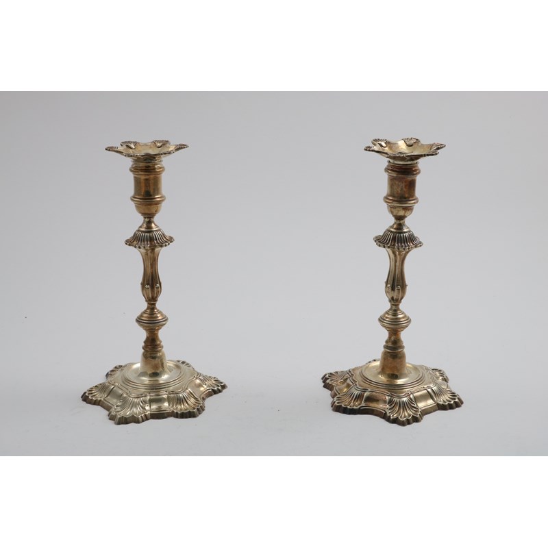 on hexafoil bases with shell decoration, knopped, and waisted columns and spool capitals with detachable nozzles, maker's mark "ACS", London 1966; 9" (23 cms) high; 49.2 oz (2)