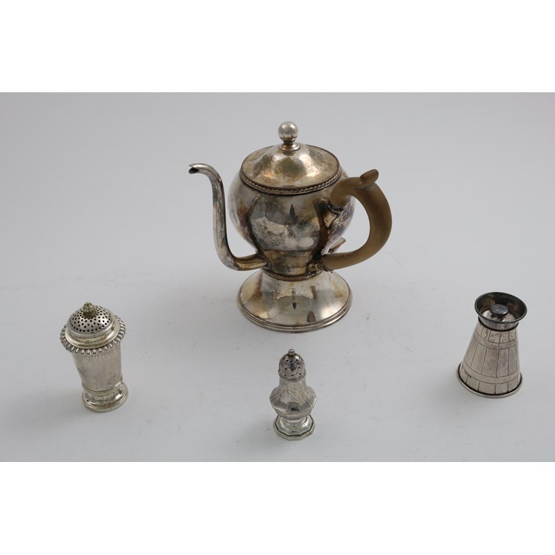 An Old Sheffield plated Argyle of baluster form with a pull-off cover and ball finial, a pepper mill by Hukin & Heath, London 1885 (metal innards), a pepperette and a plated pepperette; the Argyle 6.75" (17.2 cms) high (4)