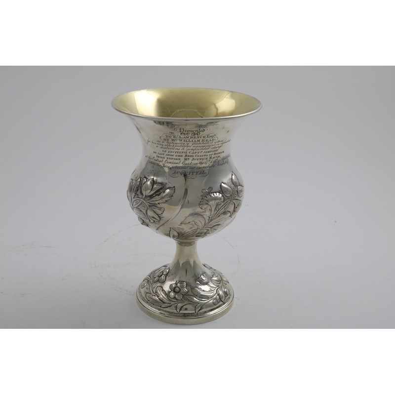 with repousse-work flowers and wrythen fluting, the thistle-shaped bowl inscribed on one side "Presented to E. Lawrence Esq. by Mr William Read as testimony of gratitude and esteem for his very able and judicious management in defending a malicious and unfounding charge of inciting Captain Simpson to cast away the Brig Colina of Ipswich, tried before Mr Justice Maule at the central criminal court on the 17th & 18th April 1844 when the Jury returned an immediate verdict of AQUITTAL", gilt interior, maker's mark "IW", London 1838; 8.7" (22 cms) high; 16.1 oz