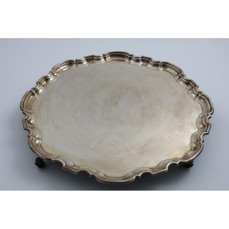 A LATE 20TH CENTURY SALVER of shaped circular outline with a moulded border and scroll feet, by Adie Brothers, Birmingham 1961; 16.5" (41.8 cms) diameter; 52.6 oz