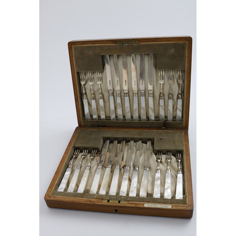 AN EARLY 20TH CENTURY CASED SET OF TWELVE PAIRS OF MOTHER OF PEARL HANDLED FRUIT KNIVES & FORKS by Pearce and Sons Ltd., Sheffield 1917; the case measuring 11.5" (29.2 cms) long