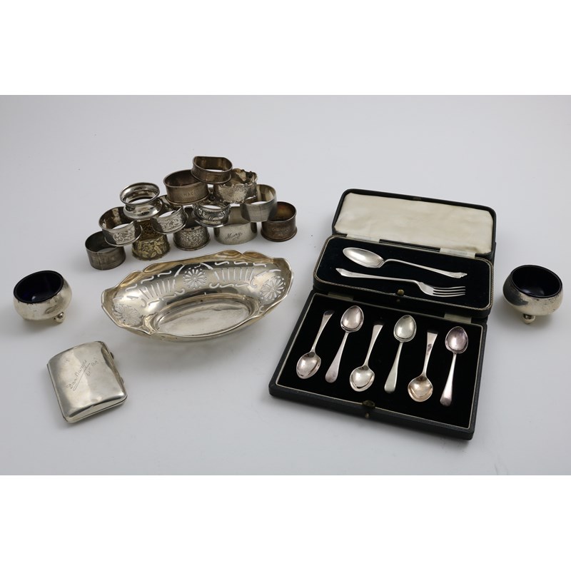 Thirteen various napkin rings, most with engraved names/dedications, a bonbon dish, a cigarette case inscribed "Dan Burges 61st Reg", a pair of Victorian salts with blue glass liners, a cased spoon & fork, initialled and a cased set of six coffee spoons; 19.4 oz weighable silver (lot)