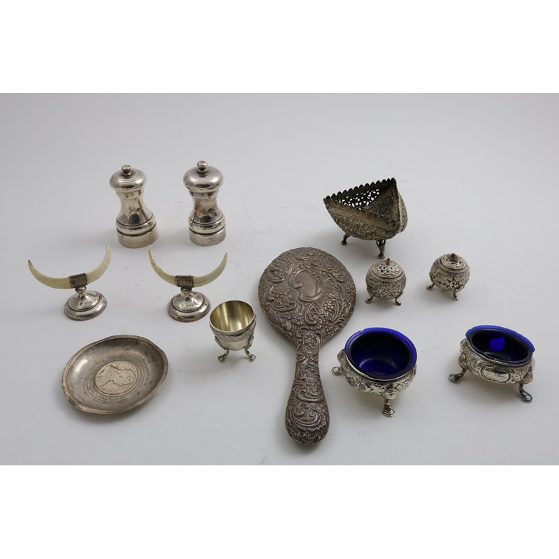 A small Egyptian coin-inset dish, a small Indian dish with a tricorn rim, a pair of Indian globular peppers, a French egg cup, a pair of George II salts A/F, two pepper mills, a pair of mounted husk knife rests and a hand mirror; the latter 10.75" (27 cms) long; 12.9 oz weighable silver (lot)