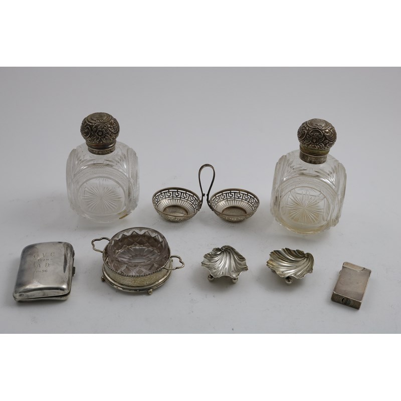 with embossed globular hinged covers and glass stoppers, initialled, by two different makers, Birmingham 1892/93, together with a pair of small shell salts, a dish with non-matching glass liner, a double bonbon dish, a cigarette case, initialled and dated "1896", and a Dunhill pocket lighter with engine-turning inscribed "Lottie"; the latter 2.25" (5.7 cms) high; 6 oz weighable silver (8)