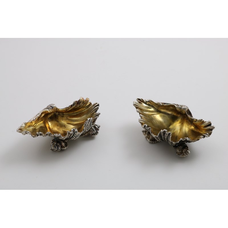 A PAIR OF VICTORIAN ELECTROPLATED CAST, NATURALISTIC SALTS in the form of shells with gilt interiors and periwinckle feet, by Elkington & Co.; 5" (12.7 cms) long (2)