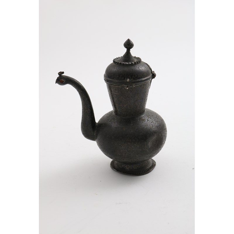 decorated all over with engraved arabeque friezes of alternating flowerheads and stylised flowers, the end of the spout originally set with three gemstones (noe deficient, unmarked, Kashmir, c.1725; 74" (18.8 cms) high; 9.3 oz