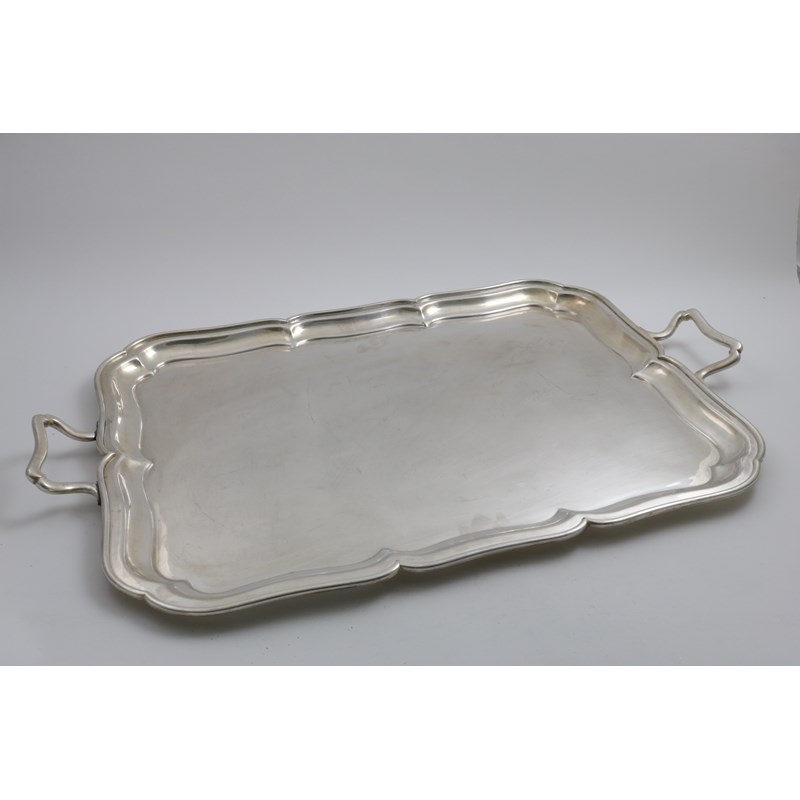 A LARGE, ELECTROPLATED, TWO-HANDLED TRAY of shaped rectangular outline with a moulded border, by Mappin & Webb; 28.6" (72.5 cms) long