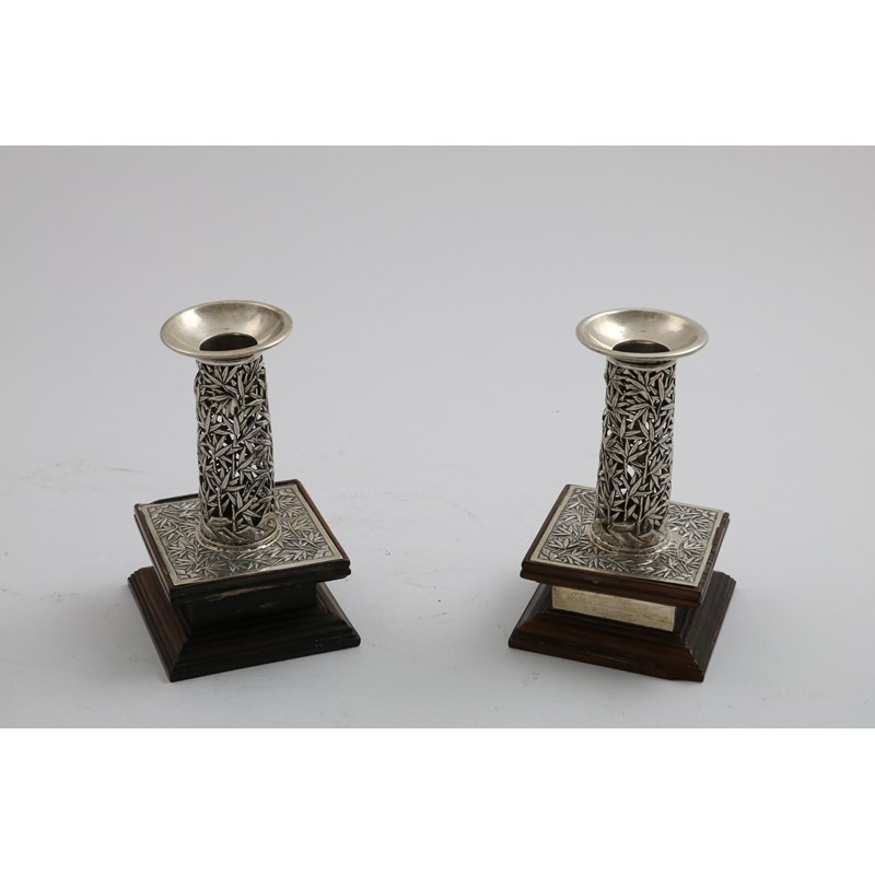 with pierced bamboo-decorated columns, chased square bases and bevelled wooden plinths; one with an inscribed plaque "2nd Prize Ladies Nomination Race 15th April 1893", by Wang Hing & Co.; 5.1" (13 cms) high overall (2)
