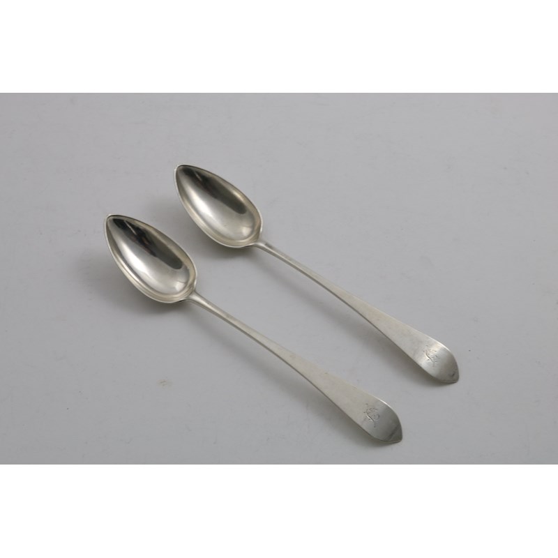 A PAIR OF GEORGE III SCOTTISH PROVINCIAL DESSERT SPOONS with Celtic points, initialled "J", by William Clarke of Greenock (WC, anchor, c, greenoak), c.1815-20; 1.9 oz (2)