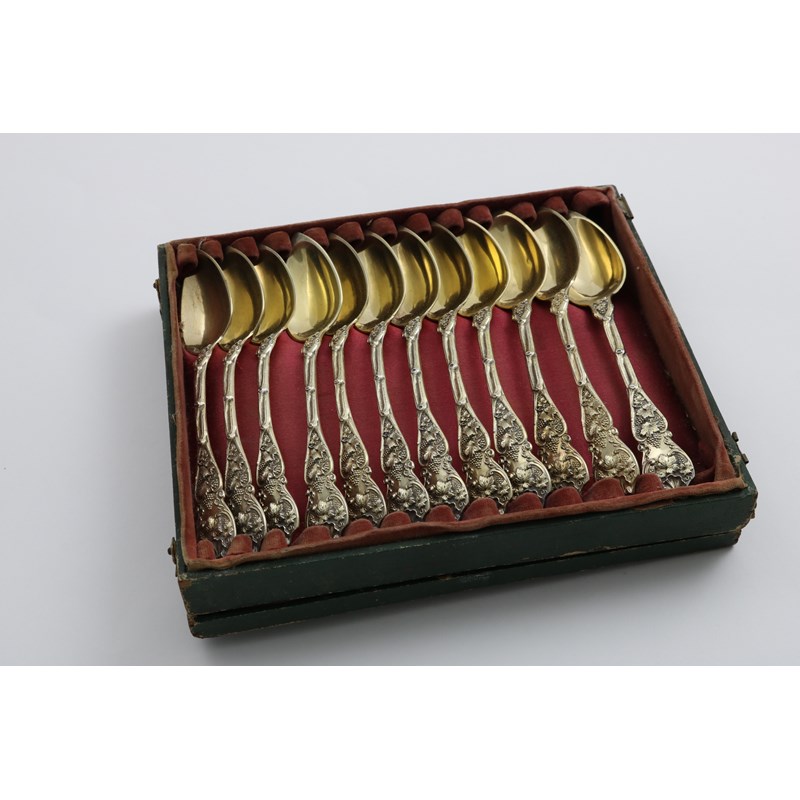 A CASED SET OF TWELVE MID 19TH CENTURY FRENCH SILVERGILT TEA SPOONS