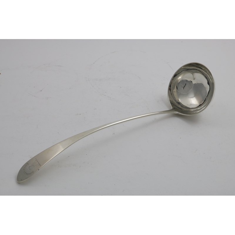 A GEORGE III SCOTTISH SOUP LADLE with a Celtic point and a circular bowl, engraved crest and motto "CORDE ET MANU" by Francis Howden, Edinburgh 1798; 14.5" (36.8 cms) long; 6.25 oz