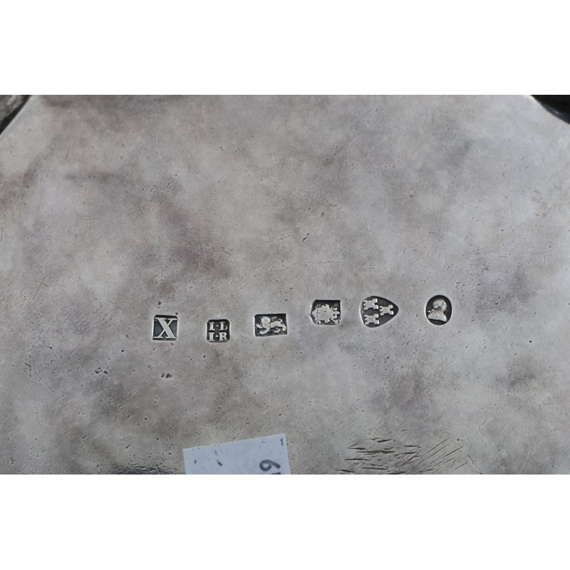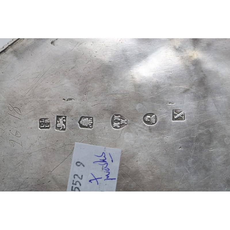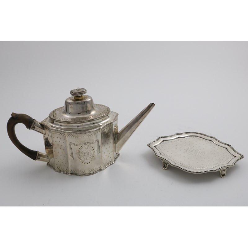 of shaped navette outline with bead borders, bright-engraved borders and a ground of engraved pelleted spots, the tea pot with a high-domed cover and an oval cartouche engraved on each side with drapery festoons, the stand one cartouche intialled "TH", by John Langlands and Jon Robertson, Newcastle 1788; the tea pot 6.5" (16.5 cms) high; 30.15 oz (2)