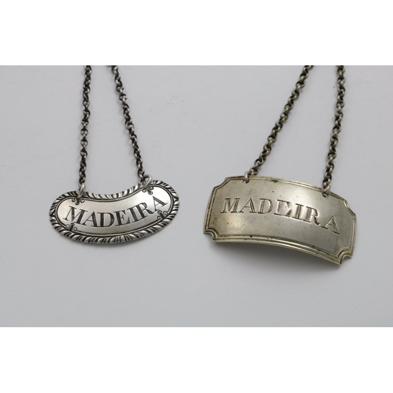 A reeded rectangular example with incurved corners incised "MADEIRA", maker's mark twice, and a kidney-shaped example with feather-edging incised & filled "MADEIRA", maker's mark and lion passant, London 1775-80; the larger one 2.2" (5.5 cms) long; 0.8 oz (2)