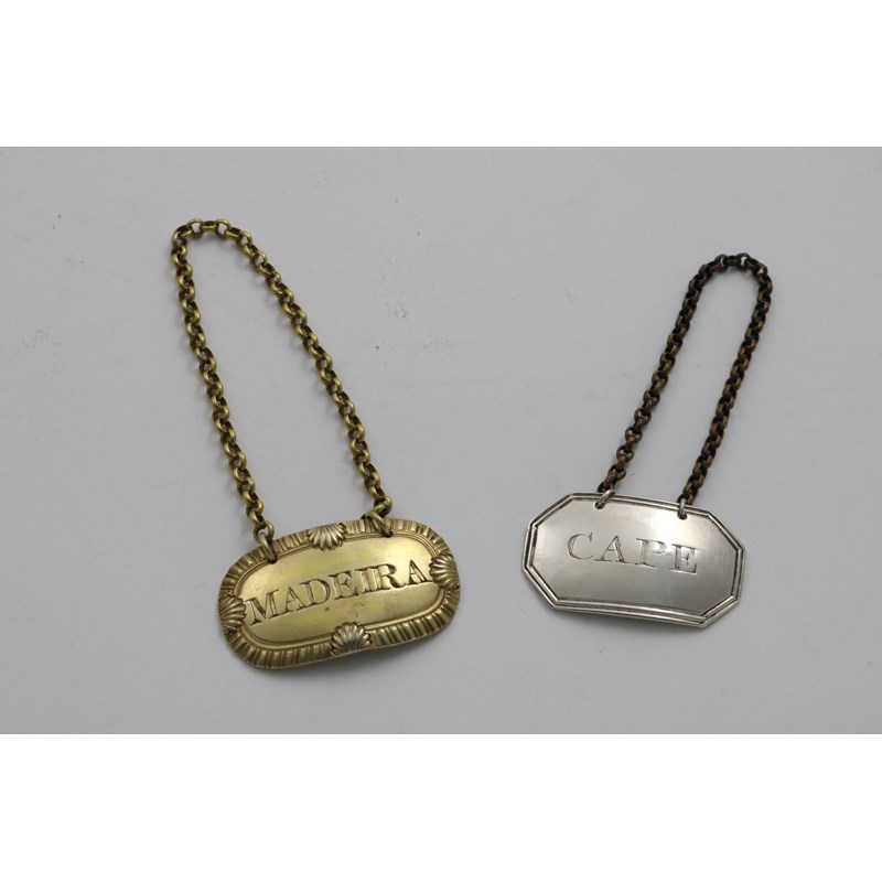 of rounded oblong form with a border of gadrooning and shells, by Charles Rawlings, London 1827 and a George III canted rectangular wine label with a reeded border incised "CAPE", maker's mark only "IR", possibly provincial, c.1810; the latter 1.55" (4 cms) long; 0.7 oz (2)