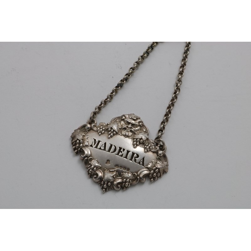 shaped outline with fruiting vine & scroll border and a Bacchanalian mask surmount, pierced "MADEIRA", by Robert Garrard, London 1851; 2.5" (6.4 cms) long; 1.35 oz