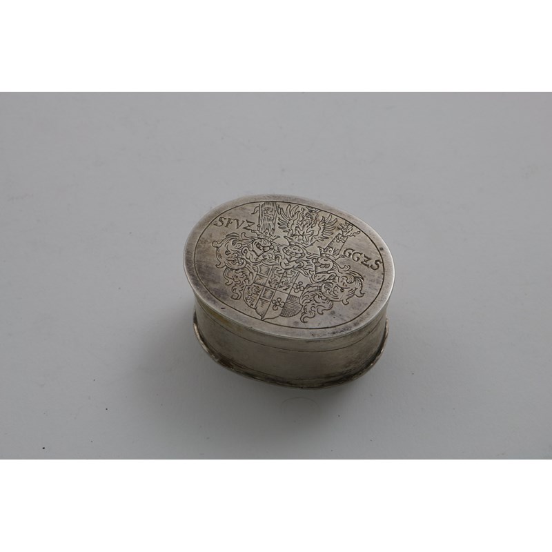 Oval with a pull-off cover, engraved with a coat of arms, flanked by the initials "SFVZ" and "GGZS", unmarked, probably German, 1st half of the 18th century; 2.1" (5.3 cms) long; 1.35 oz