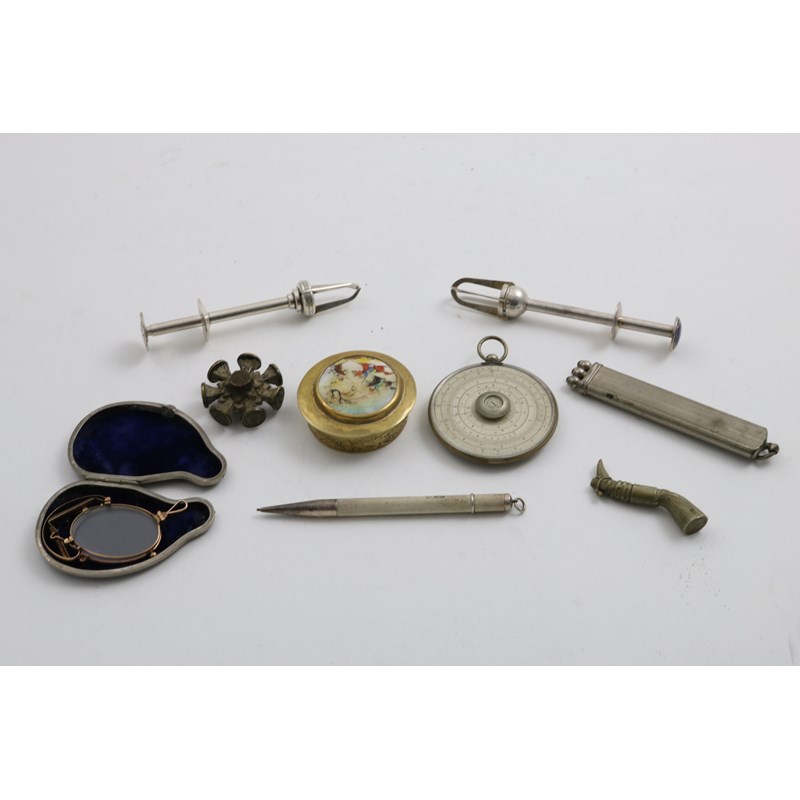 A circular calibrated rule, gilt metal pinz-nez in a gun-metal case, a nickel "leg" pipe tamper, a plated revolving seal, a 3-colour nickel pencil, a brass box, two Norwegian plated sugar grabs (one with enamel) and a pencil; the rule 2.3" (6 cms) diameter (9)
