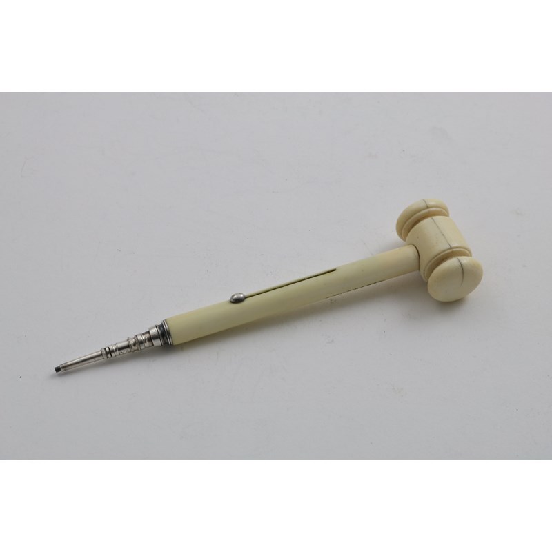 A VICTORIAN NOVELTY MOUNTED IVORY PENCIL in the form of a gavel or hammer with a slide action, by S. Mordan & Co., c.1880; 4" (10 cms) long