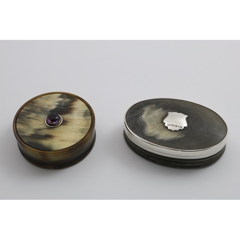 oval with a shield cartouche on the cover by William Dunningham & Co. of Aberdeen, c.1900 and a circular horn snuff box with a glass base and a faceted amethyst quartz boss on the cover; the latter 2.75" (7 cms) diameter (2)