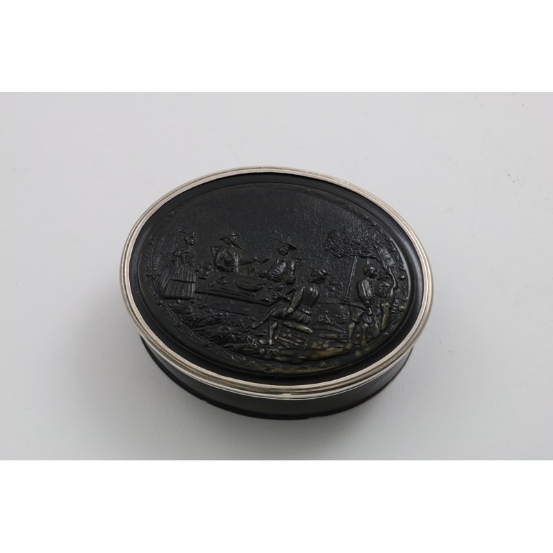 the pull-off cover with an outdoor tavern scene in relief: three men at a table, smoking and drinking punch, a serving maid to the left and a fourth man answering nature's call to the right, signed "SL" for Samuel Lambelet (a contemporary of John Obrisset), 1710-20; 4" (10 cms) long