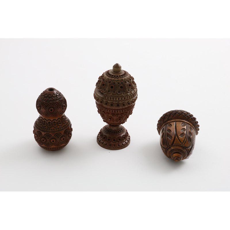 in the form of an acorn, a carved coquilla nut money box, in the shape of an urn and a carved coquilla nut flask (lacking stopper); the nutmeg grater 3" (7.6 cms) long (3)