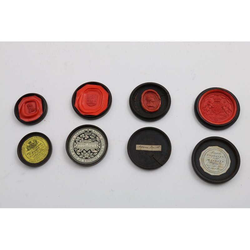 containing hard wax seal of arms of the Royal Artillery or Royal Engineers, by Edward Burch, RA (1730-1814), with his label, 24 Charlotte Street; another, hard wax seal, but of (?) Earl of Eldon, Lord High Chancellor label of Benjamin Warwick; hard wax oval seal, bust of Adam Smith; hard wax armorial seal, by Allan Wyon (1843-1907), with his label as "Chief engraver of Her Majesty's Seals", c.1884 to 1901, the largest box 2.25" (5.7 cms) diameter (4)