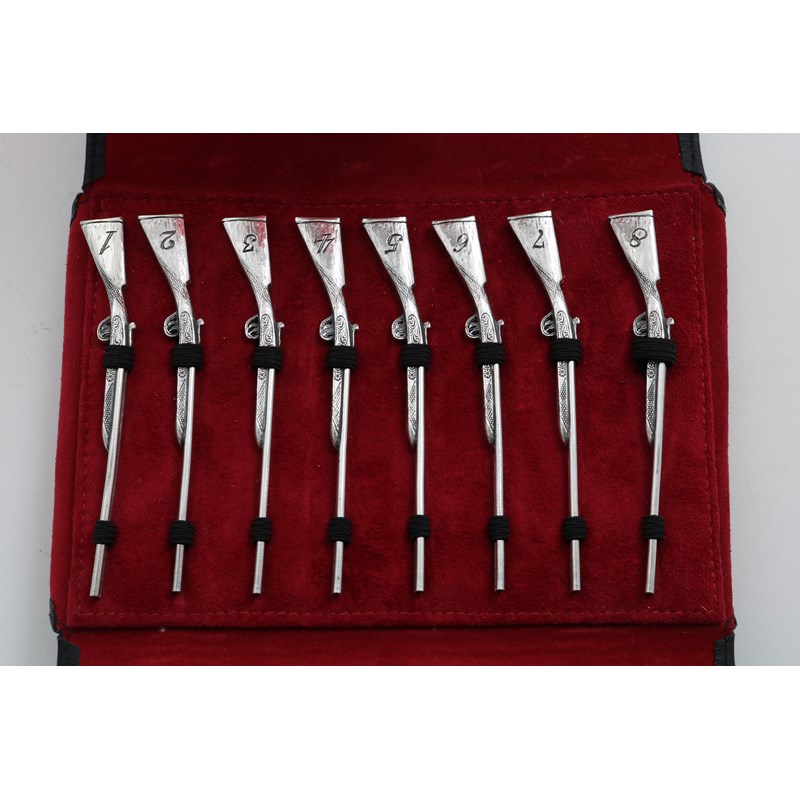 A contemporary set of eight butt markers, each realistically modelled as a miniature side-by-side shotgun, with engraved detail, maker's martk "WW", Birmingham c.2000 (no date letters), contained in a leather case; 4" (10 cms) long each; 4 oz