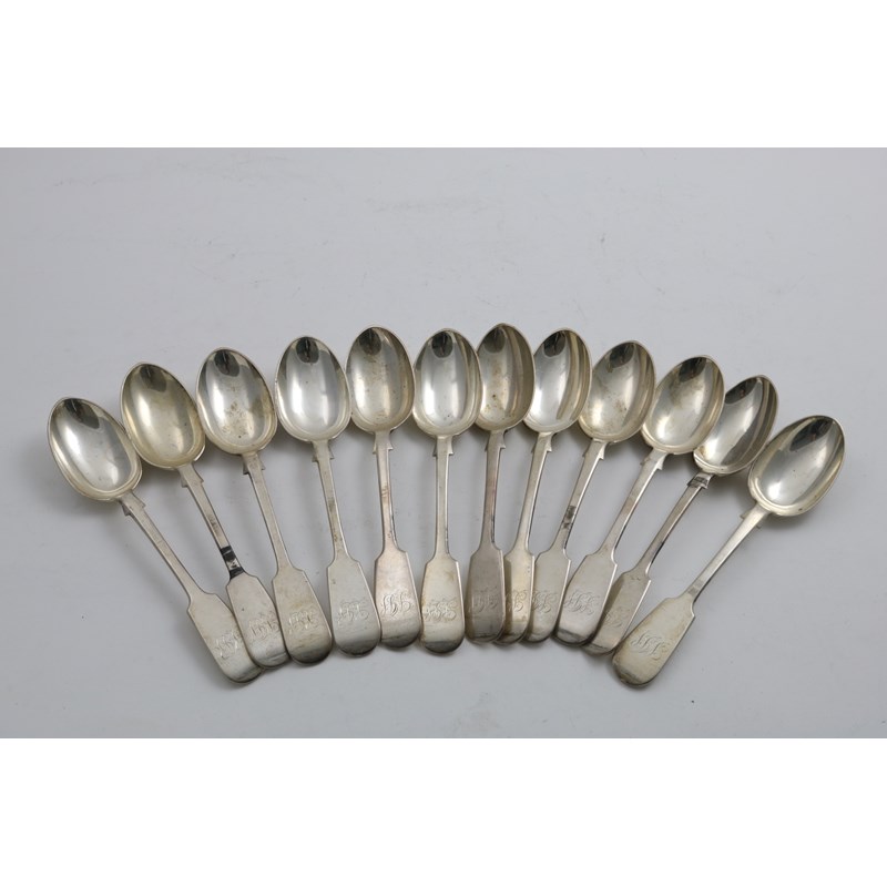 A SET OF TWELVE LATE VICTORIAN FIDDLE PATTERN DESSERT SPOONS initialled "SJS", by George Maudsley Jackson, London 1884; 19.35 oz (12)