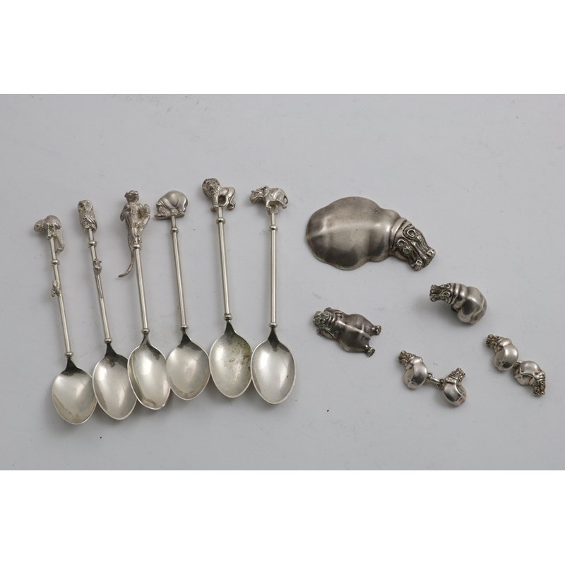 A set of three late 20th century small hippopotamus paper weights, a pair of hippo cufflinks and a set of six coffee spoons (each with a different bird or animal terminal); the spoons 4" (10 cms) long; 6.5 oz (11)