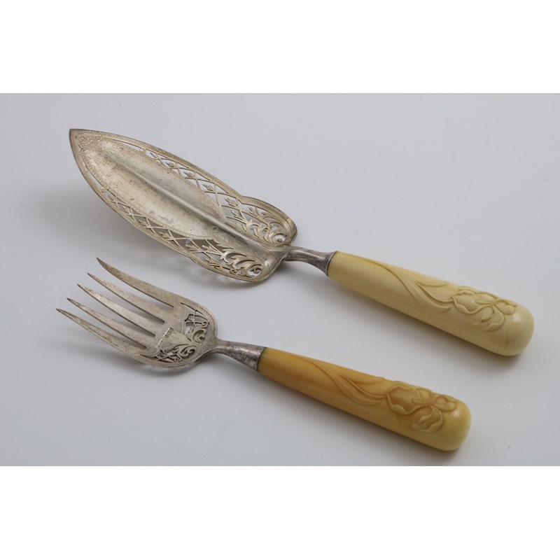 A PAIR OF EDWARDIAN FISH SERVERS with pierced and engraved decoration and ivory handles carved with an iris flower, by James Dixon & Sons, Sheffield 1906; the slice 10.7" (29.5 cms) long (2)