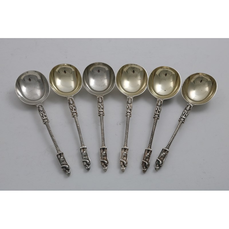 with cast figure terminals, part-twist stems and deep oval bowls, by Messrs.Lias, London 1873; 6.95" (17.2 cms) long; 9.25 oz (6)