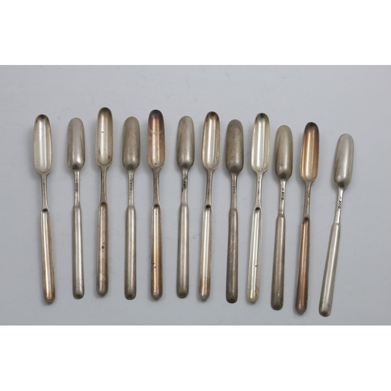 A RARE SET OF TWELVE GREAT WAR PERIOD MARROW SCOOPS by the Goldsmiths & Silversmiths Co.Ltd., London 1916; 8.75" (22.2 cms) long; 19.75 oz (12)