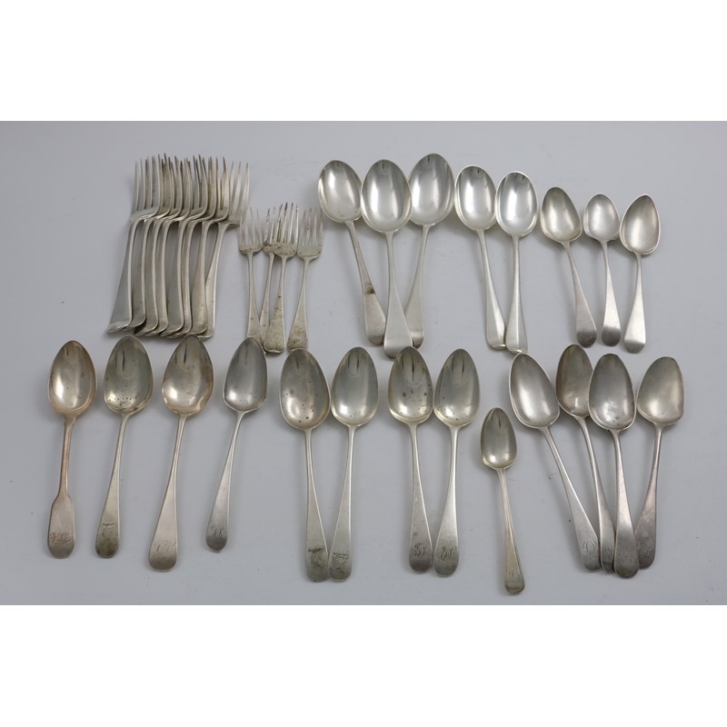 A set of eight George III table forks, Old English pattern, initialled "CTG", by Thomas Paine Dexter, London 1805, fifteen assorted George III/IV Old English dessert forks, crested, five various later table spoons and a George III tea spoon, initialled; 45.4 oz (33)