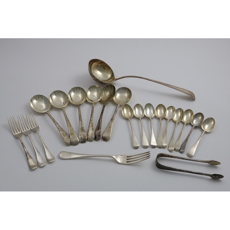 A set of nine tea spoons & a pair of sugar tongs, initialled, by Charles Boyton, London 1883, a set of six soup spoons, initialled, by Mappin & Webb, London 1928, a George III soup ladle by George Smith & William Fearn, London 1793 and four various forks; 35 oz (21)