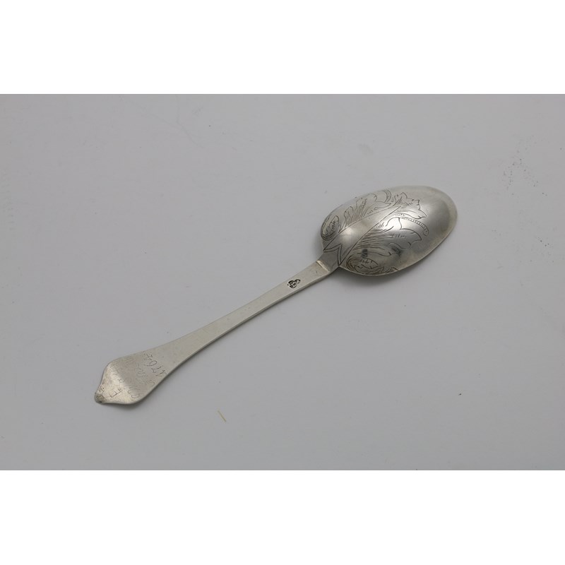 with a wavy-end terminal, engraved on onse side with a vacant scroll cartouche; the other side pricked "JWSH" over "AMLD" over "1764", the back of the bowl engraved with foliage and a Rattail, maker's mark only, "HB" (conjoined) over "S" by Hans Budtz Sommerfeldt, Aalborg, c.1764; 7.5" (19 cms) long; 1 oz