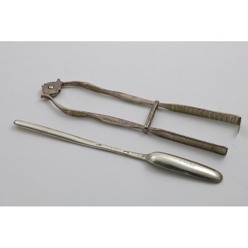 with feather-edging and a sprung pivot, maker's mark "IH", London c.1780 (no date letter), a George III marrow scoop engraved with the coronet & crest of a Viscount; the latter 8.5" (21.5 cms) long; 4.4 oz (2)