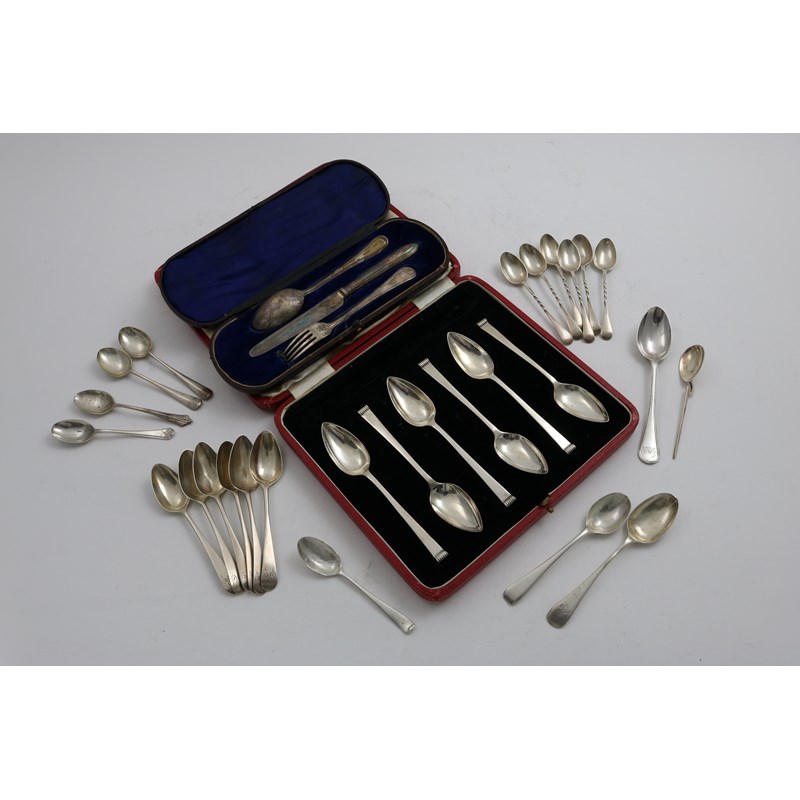 Sheffield 1939, a cased Christening knife, fork and spoon, and a set of six coffee spoons with twist stems and fifteen other various tea spoons; 15.9 oz weighable silver (lot)