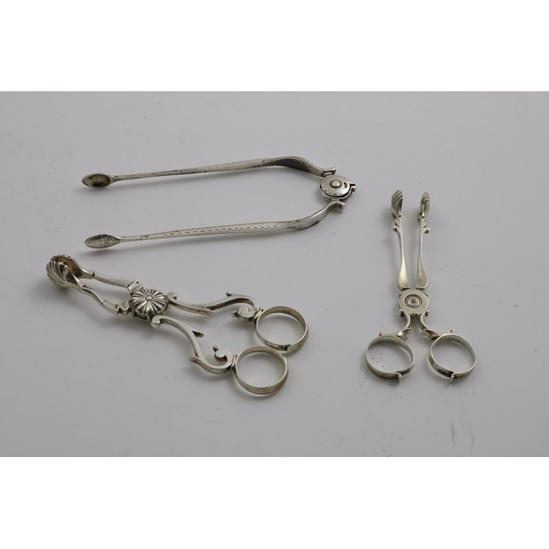 with scroll arms, shell bowls and a floret boss pivot, by Adam Elder, Edinburgh c.1825 (no date letter), together with a pair of George III sugar nips, engraved with a small crest below a Viscount's coronet, by either Richard Meach or Richard Morrison, London c.1765 and a pair of George III bright-engraved sugar tons with acorn bowls and a sprung pivot, unmarked c.1780; the Scottish pair 5.1" (13 cms) long; 4.3 oz (3)