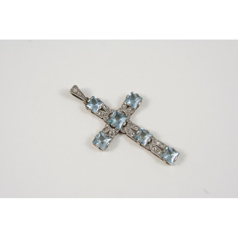 AN AQUAMARINE AND DIAMOND CRUCIFORM PENDANT set with six square-cut aquamarines and overall with rose-cut diamonds, 4 x 2.5cm.
