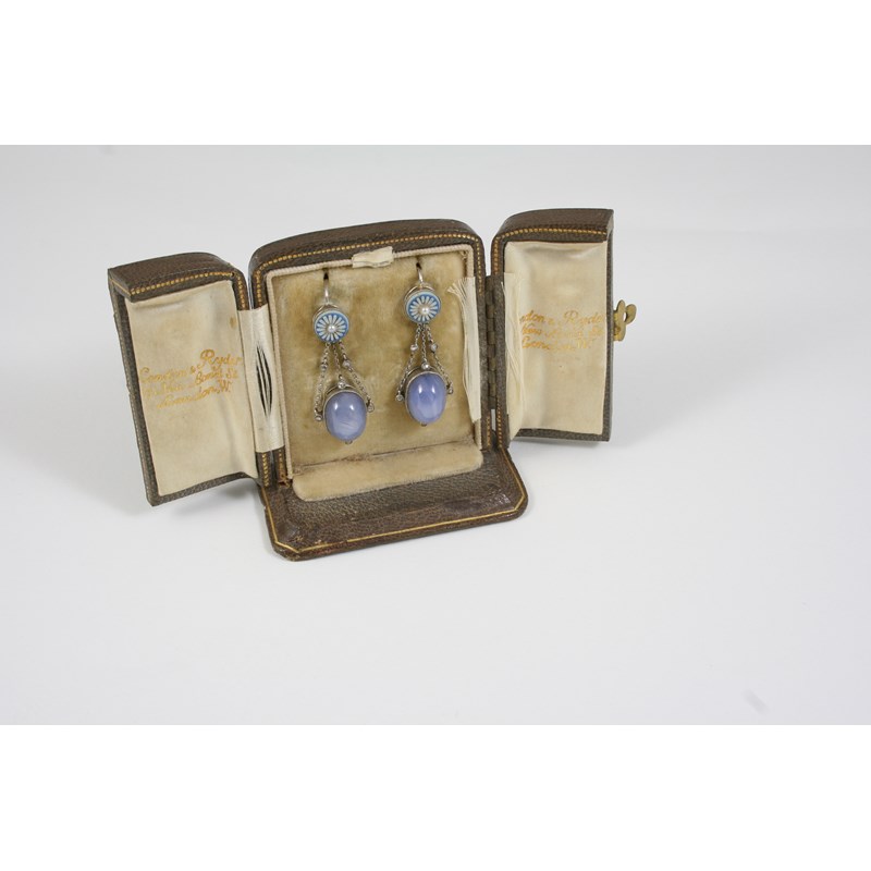 A PAIR OF STAR SAPPHIRE, DIAMOND AND ENAMEL DROP EARRINGS