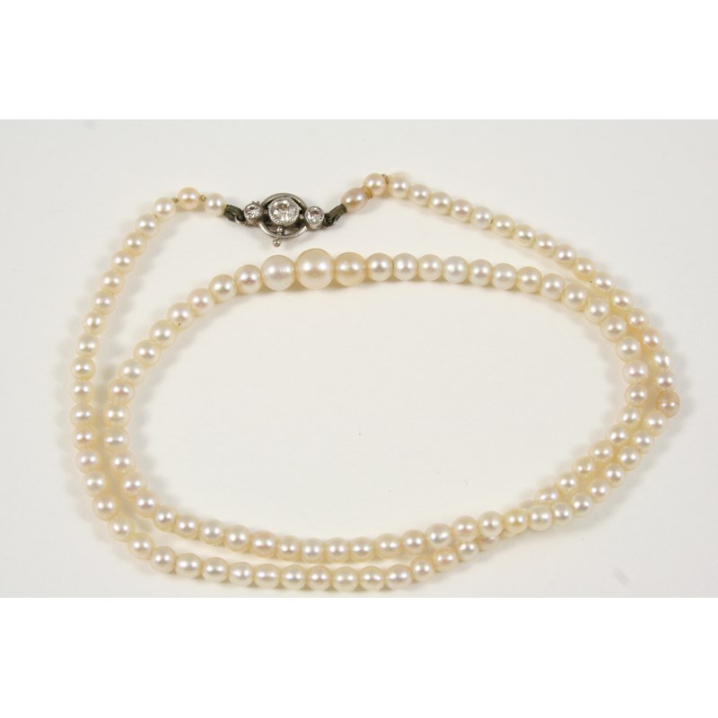 the pearls graduated from 2.8mm. to 5.0mm. to a diamond set clasp.