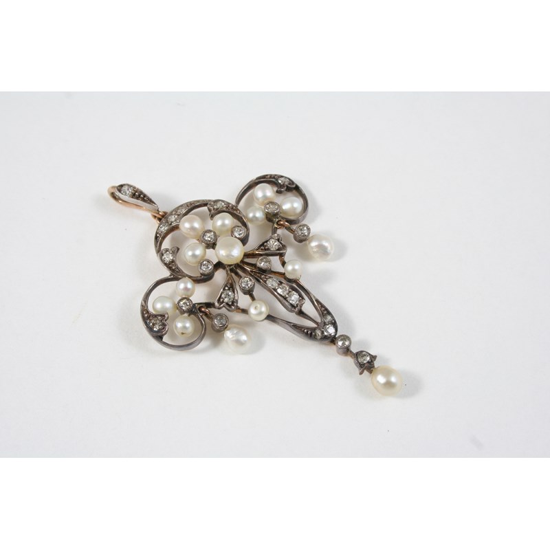 the openwork pendant is set with small pearls and with graduated old brilliant-cut diamonds, in gold, 6.5cm. long including pendant loop, in fitted case.